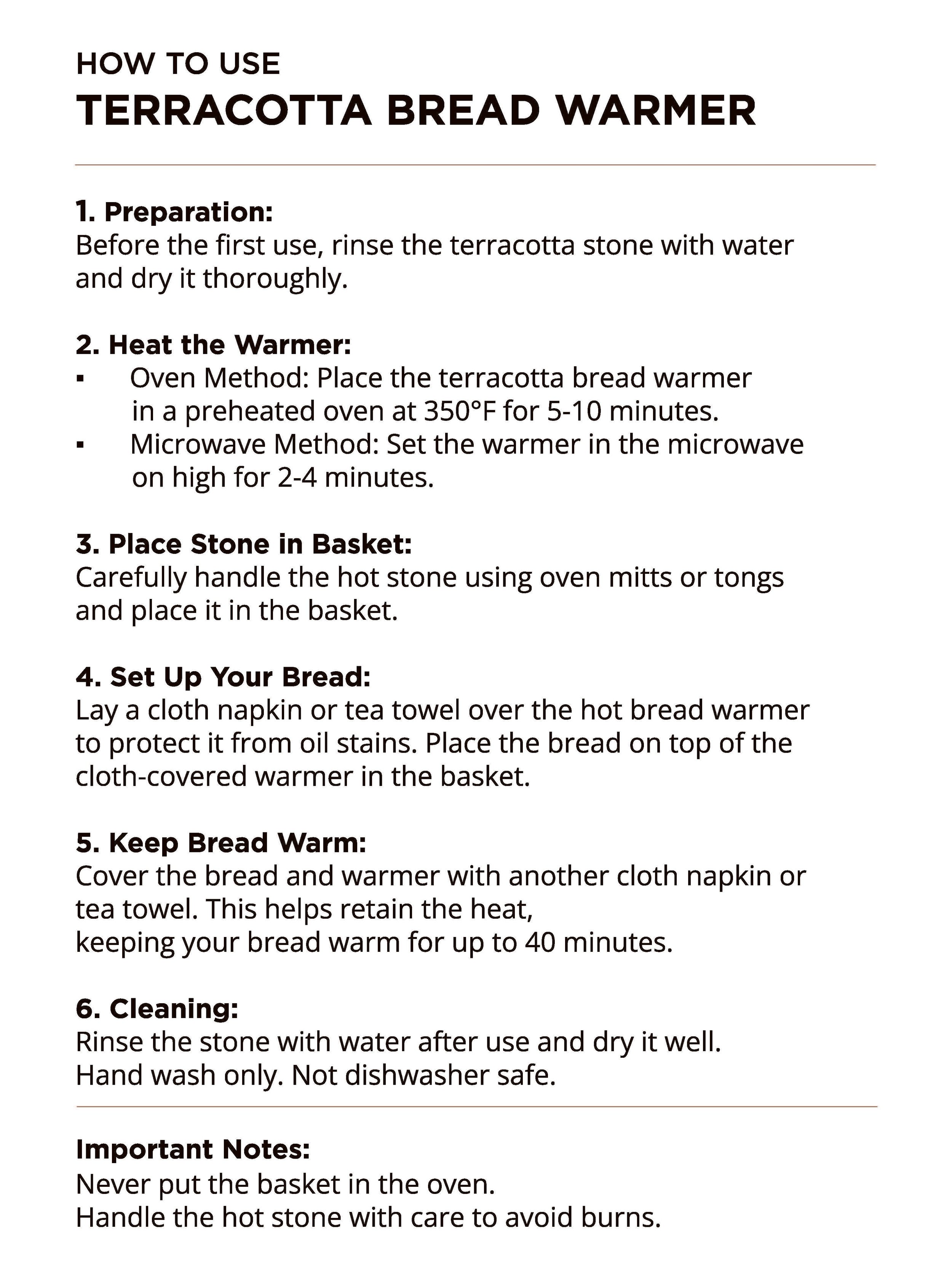 - Bread warmer: Wipe stone clean with a damp cloth. Dry well. Not dishwasher safe.